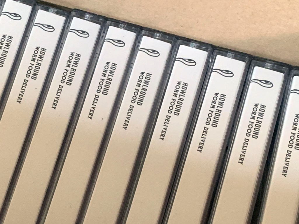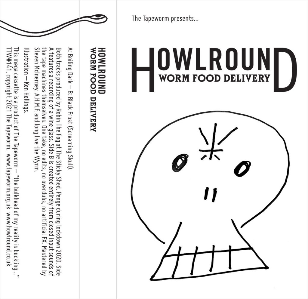 Absolutely chuffed to bits to be announcing the official release of Howlround’s seventh studio album Worm Food Delivery, now available through that bastion of delightful cassette-based noise, The Tapeworm. Blessed with original cover art by the great and redoubtable Ken Hollings, the contents of the tape prove to be no less incendiary, with two side-long tracks of blistering noise that have already been described by as GABBAUDRILLARD – literally the newest and best genre name ever!